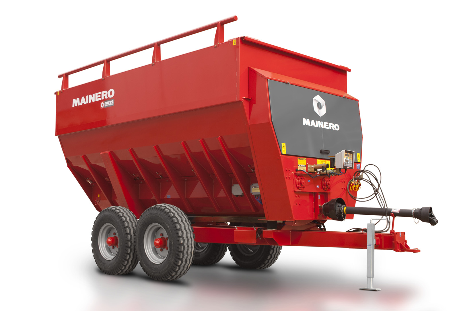 El mezclador distribuidor de raciones Mainero 2932 de 12 m³ de capacidad es un mezclador de 3 sin fines horizontales que procesa fardos enteros de heno, plantas enteras o trozadas y mezcla de productos secos o húmedos produciendo y distribuyendo raciones uniformemente procesadas y mezcladas.
