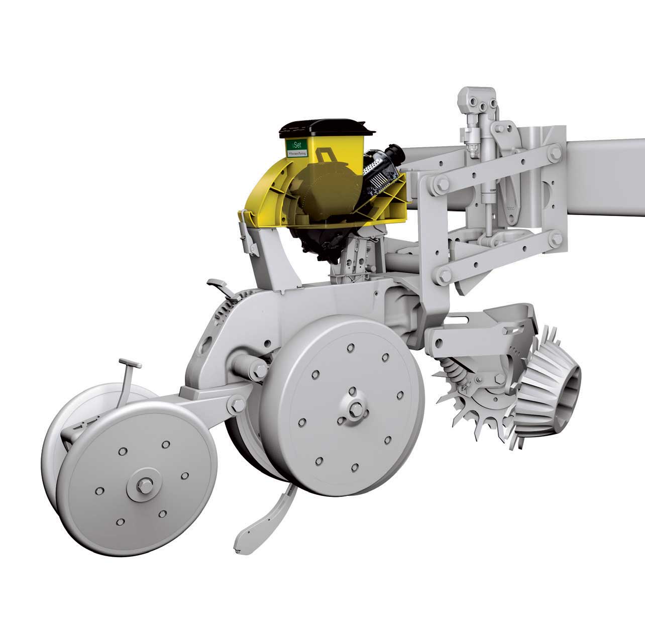 vSet hace un menor uso de turbina gracias a su eficiente sello de vacío y usa un enrasador agresivo para lograr la mejor singulación para todos los tamaños y formas de semillas. No hay necesidad de cambiar la placa, de regular el enrasador o el nivel de vacío. Para cuando la placa pasa por el enrasador, solo una sola semilla queda en posición camino al tubo. Cada vez, cada alvéolo. Sólo carga la semilla y plantá.